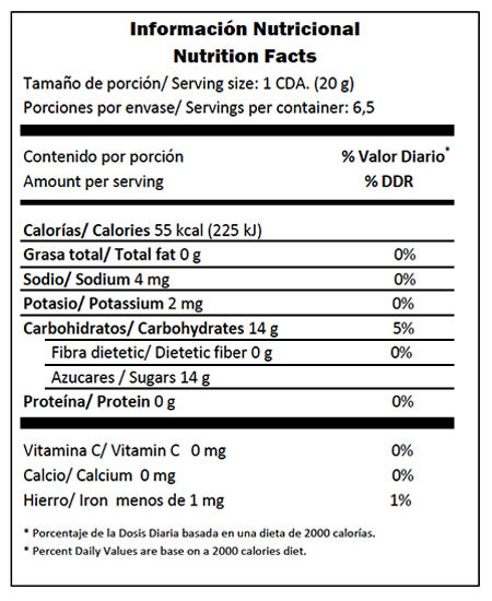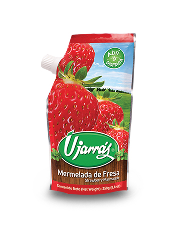 Ingredientes: Azúcar, fresa, pectina (como gelificante), ácido cítrico (como acidulante), benzoato de sodio y sorbato de potasio (como preservantes), colorante FD&C Rojo 40 y saborizante.