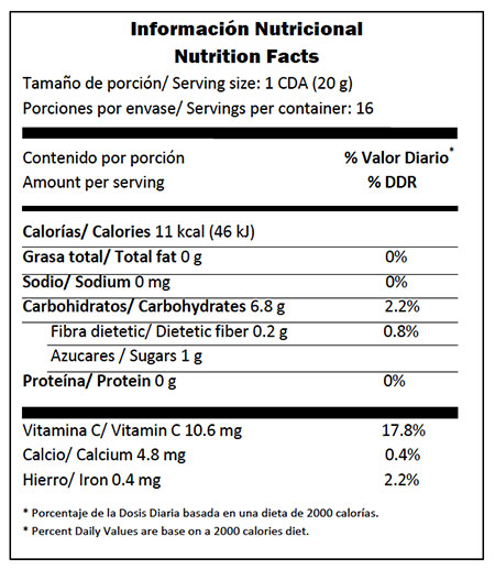 Ingredientes: Agua, mora, polidextrosa, estevia (como edulcorante),estabilizantes (goma xantan y goma algarrobo), acidulantes (ácido cítrico, ácido ascórbico), fibra dietética (inulina), sorbato de potasio (como preservante), colorante azul #1, colorante rojo #3 y saborizante artificial.
